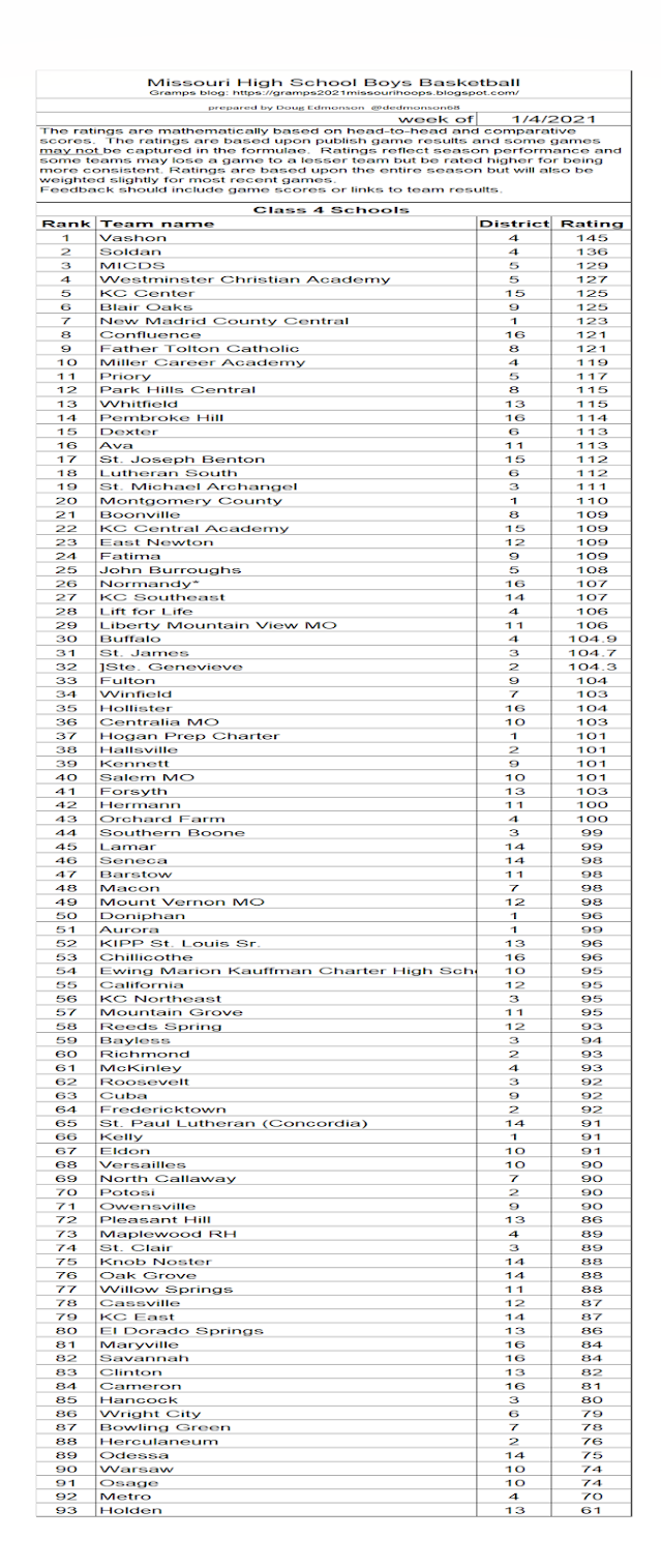 Missouri Class Four Boys Basketball ratings -week of January 3rd, 2021